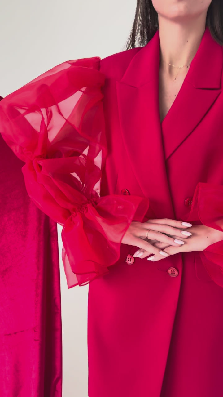 Suknelės išmatavimai (S): pečių ilgis: 42 cm, krūtinės apimtis: 102 cm, liemuo: 102 cm., klubai: 112 cm, rankovių ilgis: 78 cm., švarko ilgis: 80 cm.